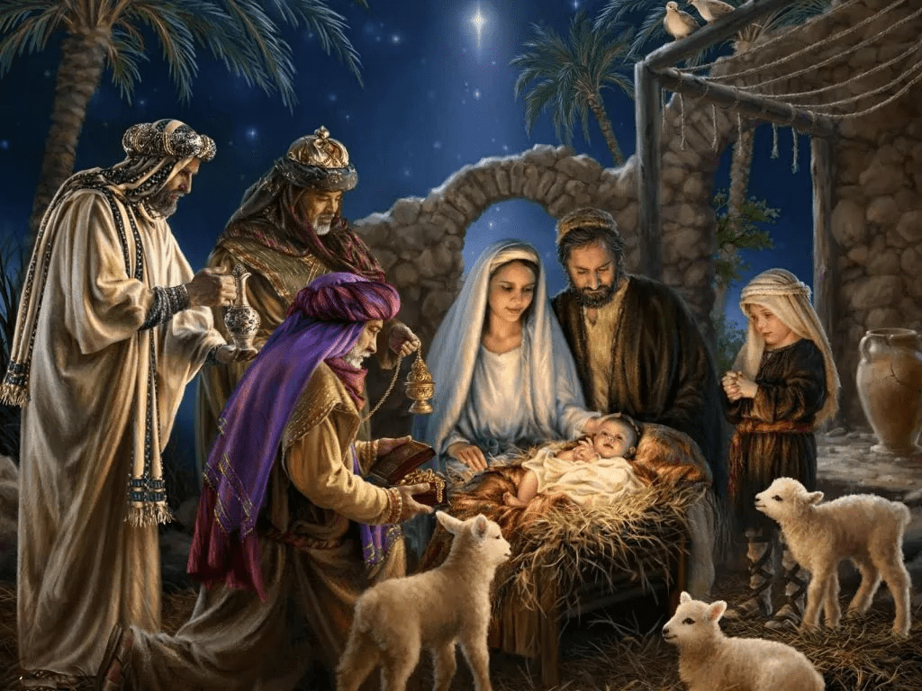 Días después, volvieron a Belén donde meses más tarde, unos reyes magos que llegaron de Oriente en una caravana de camellos guiados por una estrella, le rindieron homenaje y le entregaron tres regalos simbólicos: oro ( en reconocimiento de su realeza ), incienso ( en reconocimiento de su divinidad ) y mirra ( en reconocimiento de su naturaleza humana ). De allí, la familia huyó a Egipto por la noche para escapar del rey Herodes que perseguía al hijo del carpintero al sentirse amenazado porque los reyes venidos de Oriente le habían dicho que habían llegado a sus tierras buscando el nacimiento del rey de los judíos. Al marcharse estos sin informarle de lugar donde lo habían encontrado, Herodes, un rey nombrado por Roma, muy cruel y temido por su pueblo, se volvió paranoico ante la amenaza de perder su reinado y ordenó la Matanza de los Inocentes en la región de Belén ( todos los niños menores de dos años, siguiendo la cronología que le habían dicho lo reyes magos ).